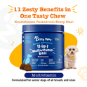 Zesty Paws 11-in-1 Mutivitamin Bites are soft chews that support hip and joint function, skin health, gut function, the immune system, heart health, brain function, liver health, eye function, urinary and kidney health, performance, and antioxidant levels for adult and senior dogs - small, medium, or large, and regardless of breed.