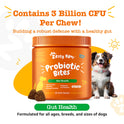 It's only natural that chowing down should be a fun part of your dog's day. That’s where we come in with Probiotic Bites. This advanced chewable is made with six strains of probiotics to support gut health. You’ll enjoy the daily relief of giving your furry little pumpkin the best premium solution for their gut, GI tract, and immune function. Plus, we know your pet has an ""allergy"" to bad flavors. So, your dog will feel happy and spoiled well with all the best special treatment thanks to Probiotic Bites' good taste that hits the spot.